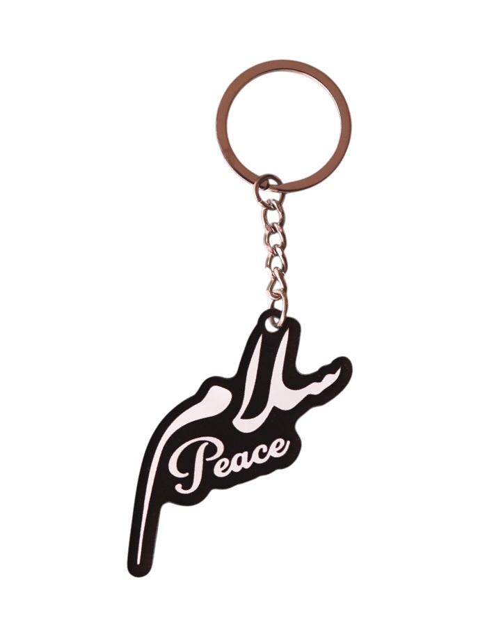 Porte clé avec la calligraphie du mot "Paix" en arabe (Salâm سلام) et en anglais (Peace).