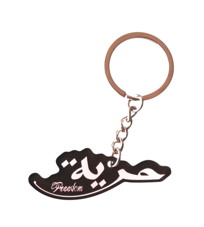 Porte clef avec la calligraphie arabe artistique du mot liberté (houriyya حرية) et en anglais "Freedom".