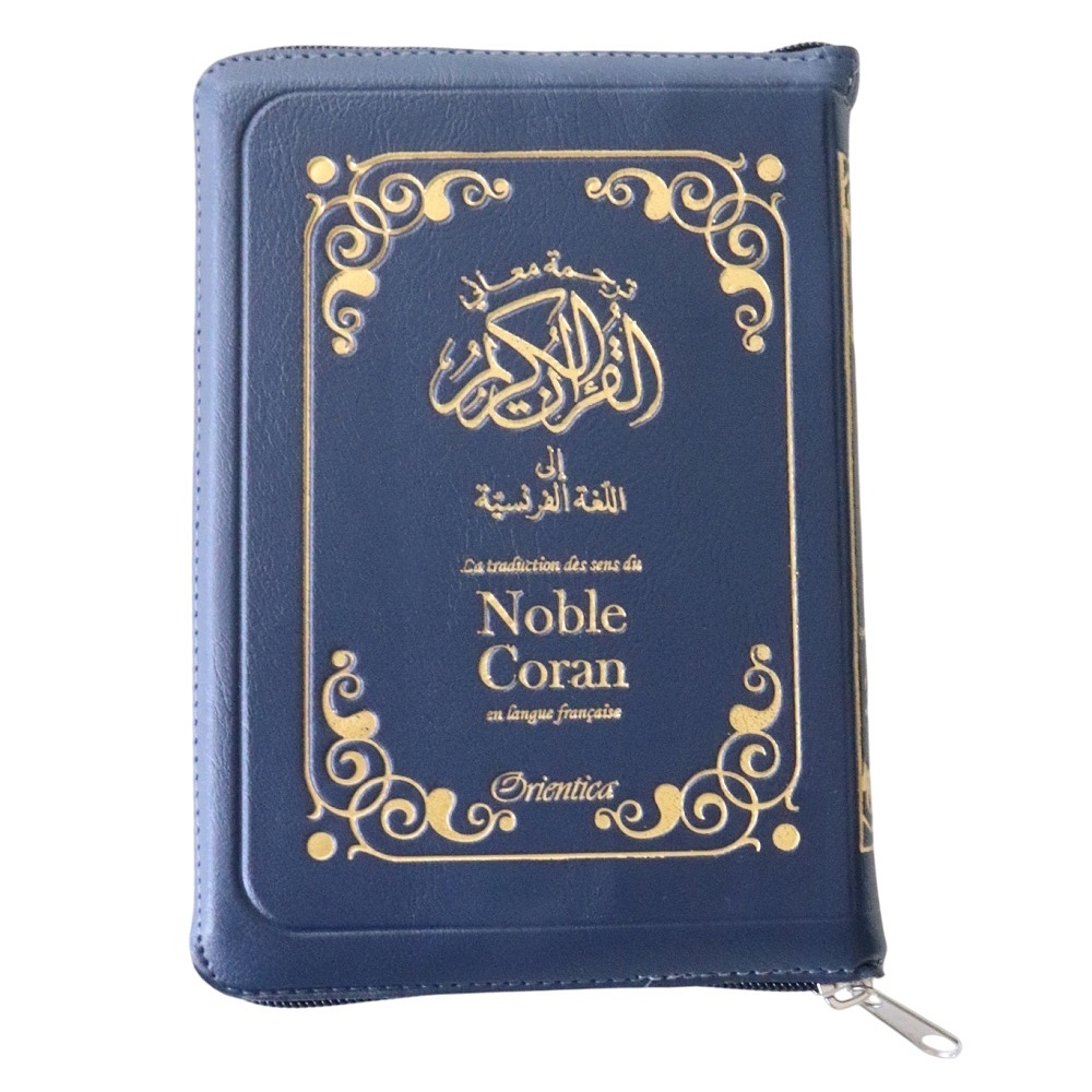 Très beau Coran au format poche 12 x 17 cm avec fermeture zip pratique pour emporter avec soit (Le Coran est protégé par sa couverture plastifiée étanche bleu-nuit). Avec marque page en soie intégré.