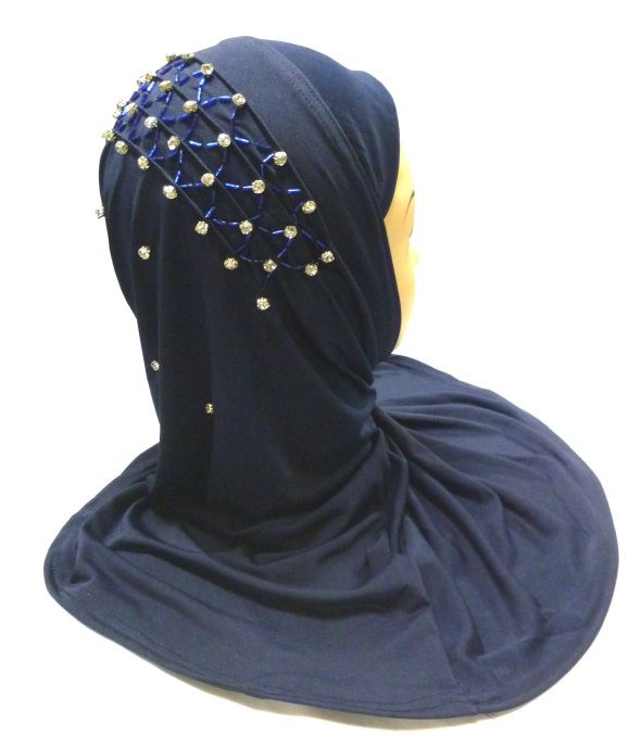 Beau Hijab 1 pièce de couleur bleue nuit, orné de perles tout au long d'une bande en forme de filet, en arrière de la tête...
