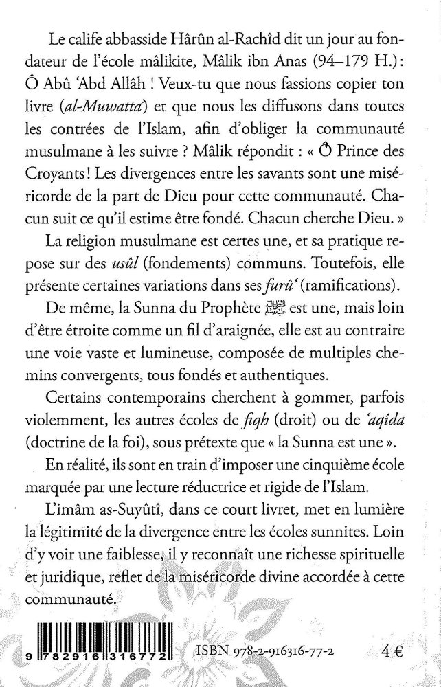 Dans ce petit livre l'imam As-Suyûtî explique la légitimité de la différence et de la divergence entre les écoles sunnites.