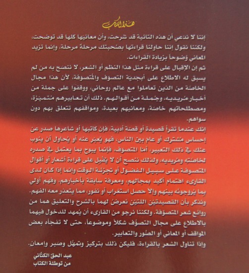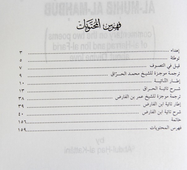 كتاب في التصوف تضمن شرحا وافيا لقصدتين من الشعر الصوفي هما :تائية الفارض وتائية الحراق . وكلتاهما في الحب الالهي ، فجاء الكتاب شارحا موضحا لغوامض .واسرار كل منهما مما يسهل فهمهما على القراء