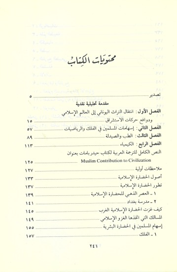 وحين ينتقل الكاتب لمعالجة إسهام المسلمين في الحضارة، نجده منذ البداية يؤكد أنه سوف يشير إلى الاكتشافات والأمثلة التي تدين أوروبا بفضلها لحضارة الإسلام. ولذا فإنه يستعرض الأمثلة المتعددة للعلوم، ومدى ما أحرزه الغرب من تقدم فيها من خلال الفكر والنظر الإسلامي، فيوضح أن الفلك والرياضيات من بين العلوم الهامة التي استدعت انتباه علماء الإسلام، ويبين على وجه الخصوص أن الخلفاء اهتموا بعلم الفلك اهتماماً كبيراً سواء في الشرق أم في إسبانيا ويشير كذلك إلى عنايتهم ببناء المراصد في بغداد والقاهرة وقرطبة وسمرقند. وهكذا نجد المؤلف يعالج الموضوعات المختلفة في مجال العلوم والطبيعة والطب والكيمياء ومدى ارتباط الكيمياء بالصيدلة وكيف أن مفكري الإسلام استطاعوا أن يستحدثوا فرعاً جديداً ن فروع الدراسات العامة والخاصة بتطبيق الكيمياء وفي الصيدلة.