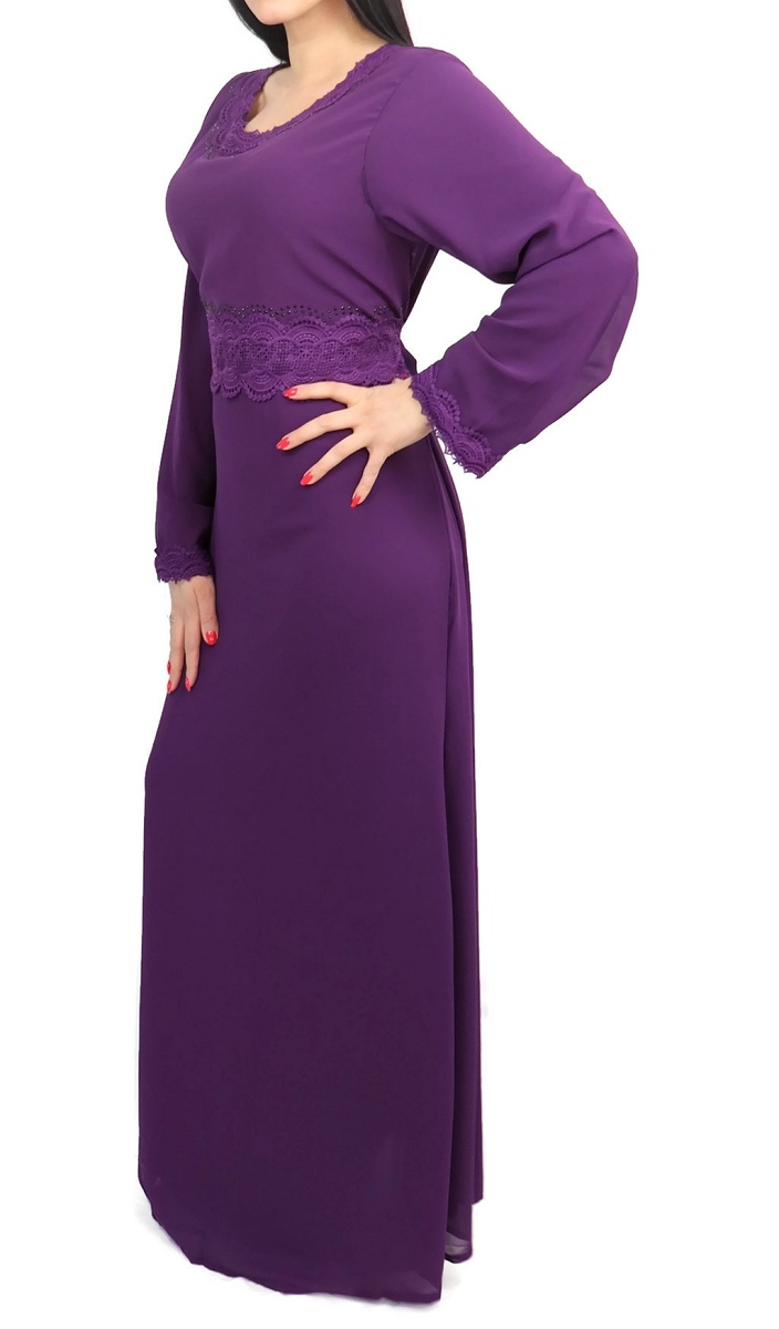 Robe à dentelles et strass sur un col dégagé ainsi que sur la taille et les poignets. Intégralement doublée. 2 liens qui peuvent aussi bien se nouer à l’avant comme à l'arrière afin de faire un effet cintré. Ce modèle sobre et distingué vous conviendra pour différents événements.