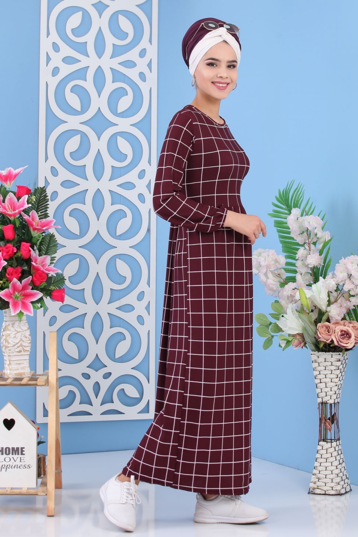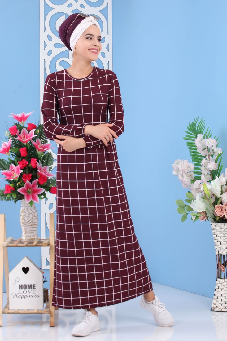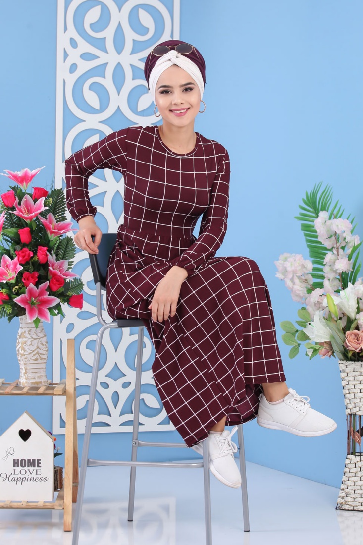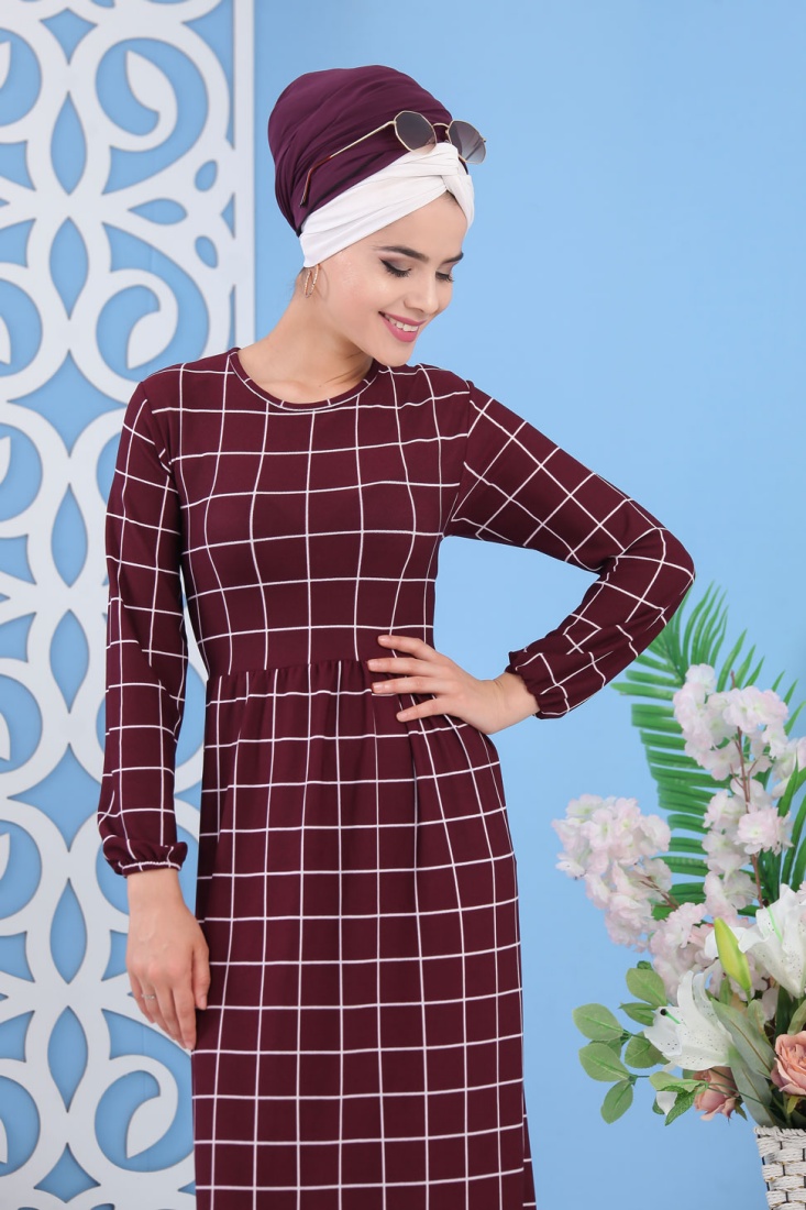 Robe avec imprimés à carreaux de couleur aubergine (grandes tailles) - Vetement femme voilée moderne Vetement & Accessoire