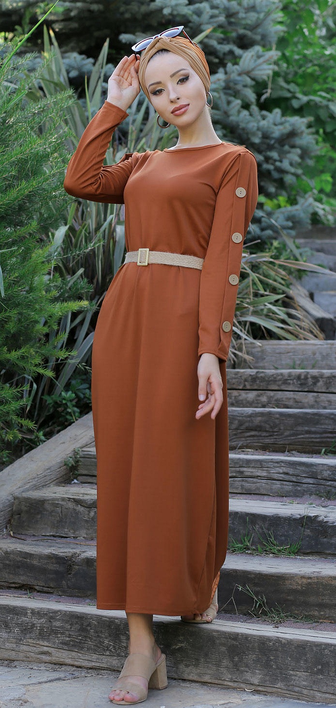Robe de ville longue décoration boutons pour femme - Couleur rouille Vetement & Accessoire