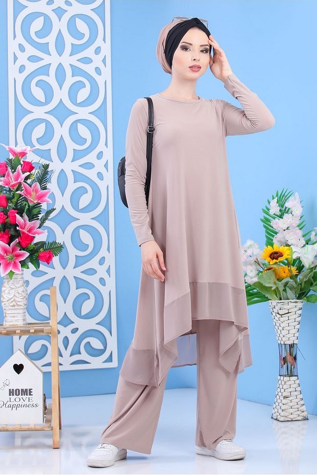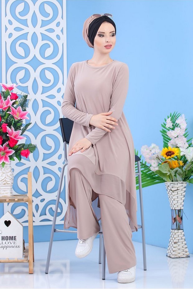 Ensemble ample pour femme : tunique et pantalon large (Vêtement chic style habillé pour femme musulmane) - Couleur beige foncé - REF. 36614 (39.90 €) - En Promotion à 32.90 €