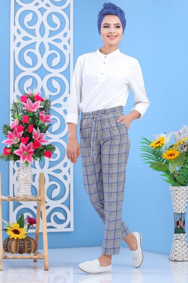 Pantalon à carreaux avec plis pour femme - Couleur Bleu Vetement & Accessoire