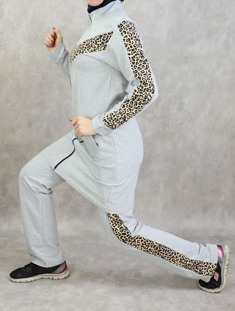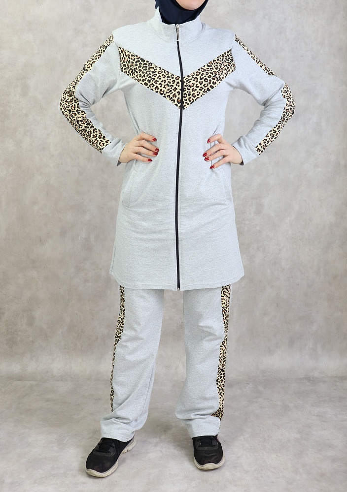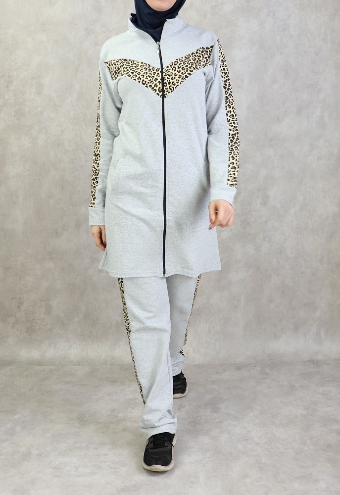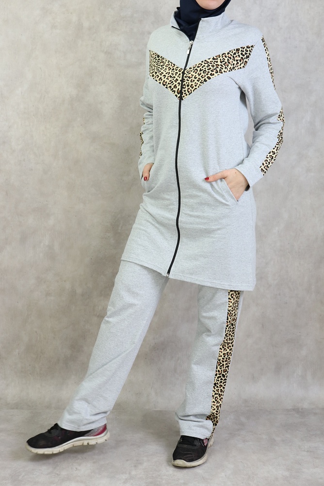 Survetement femme 2 pieces gris clair avec motifs leopard