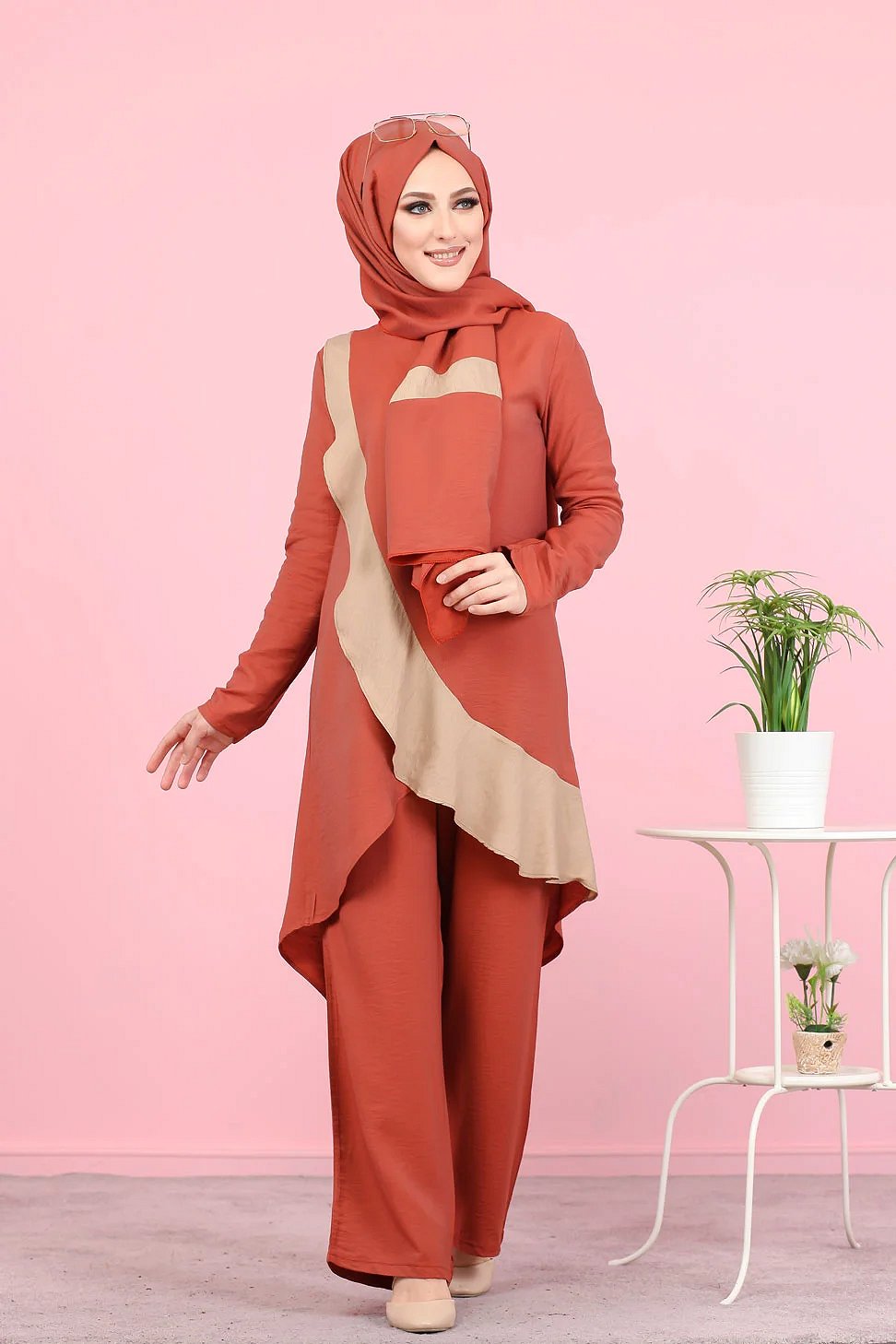 Ensemble ample 3 pieces : tunique - pantalon et voile assorti pour femme (Tenue Hijab mastour) - Couleur Brique