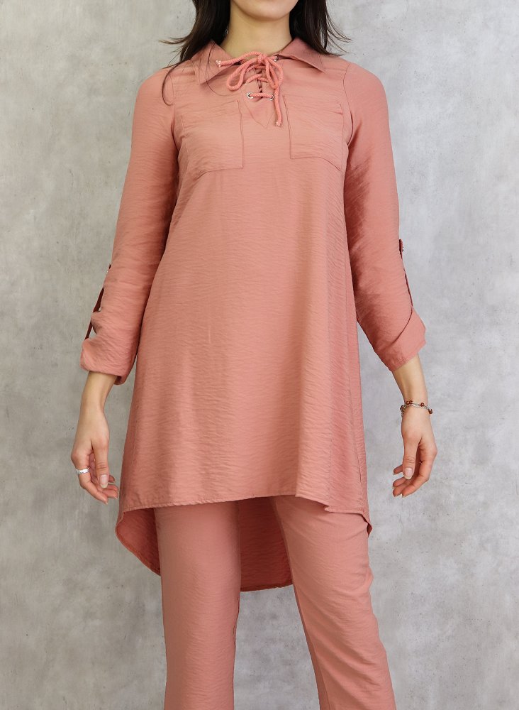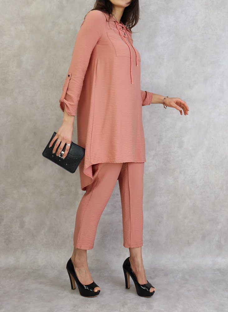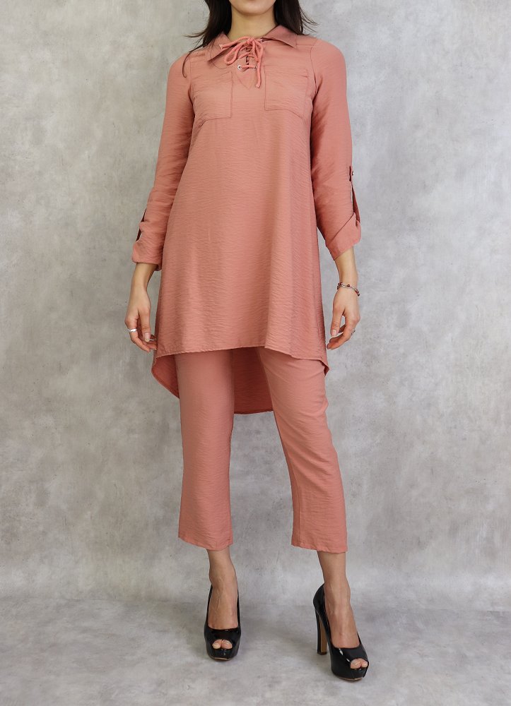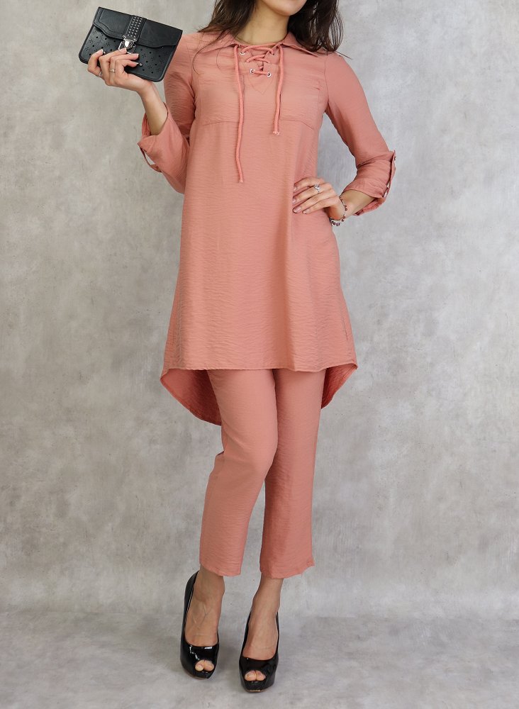 Ensemble casual : Tunique boutonnée -chemise longue- et son pantalon pour femme (Vêtement Hijab moderne) - Couleur rose poudré - REF. 37096 (35.00 €)