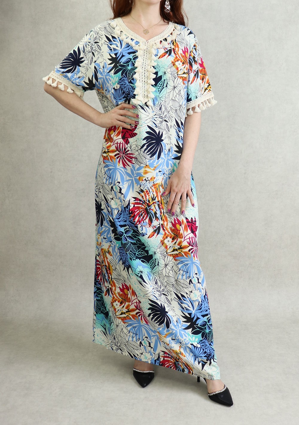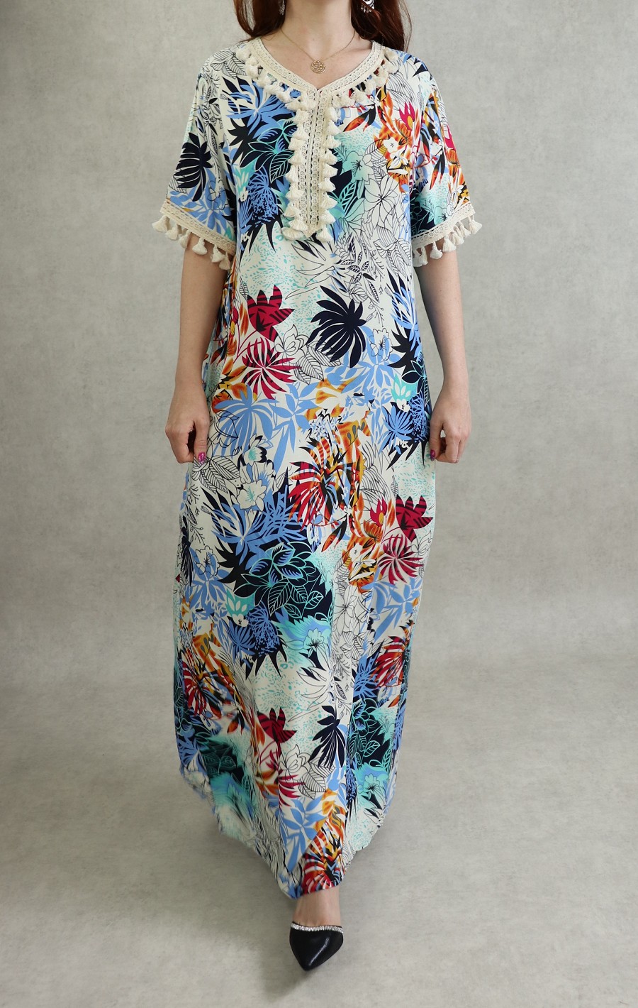 Robe longue d'été ou pour la maison à imprimé exotique pour femme, manches courtes avec broderies et pompons beige, coupe droite, tissu fluide et doux au toucher coton.