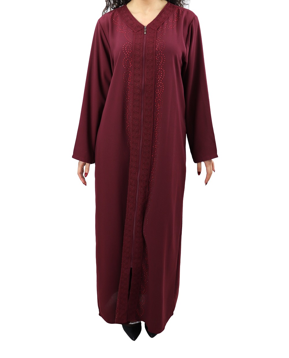 Robe / Abaya Longue a ouverture zip avec broderies et strass pour femme - Couleur Prune