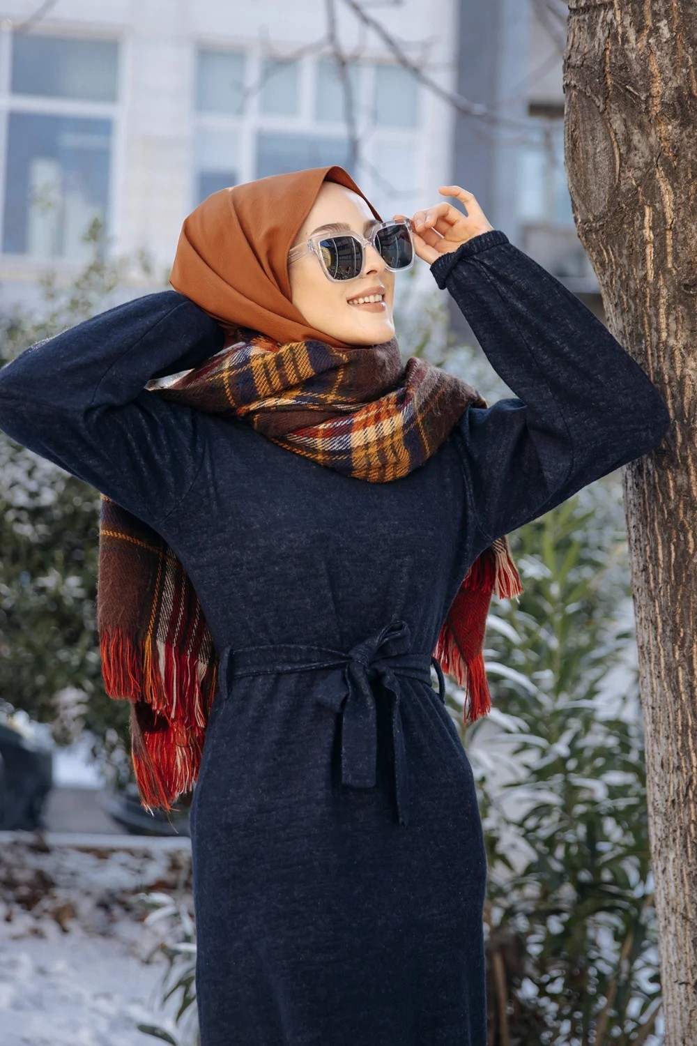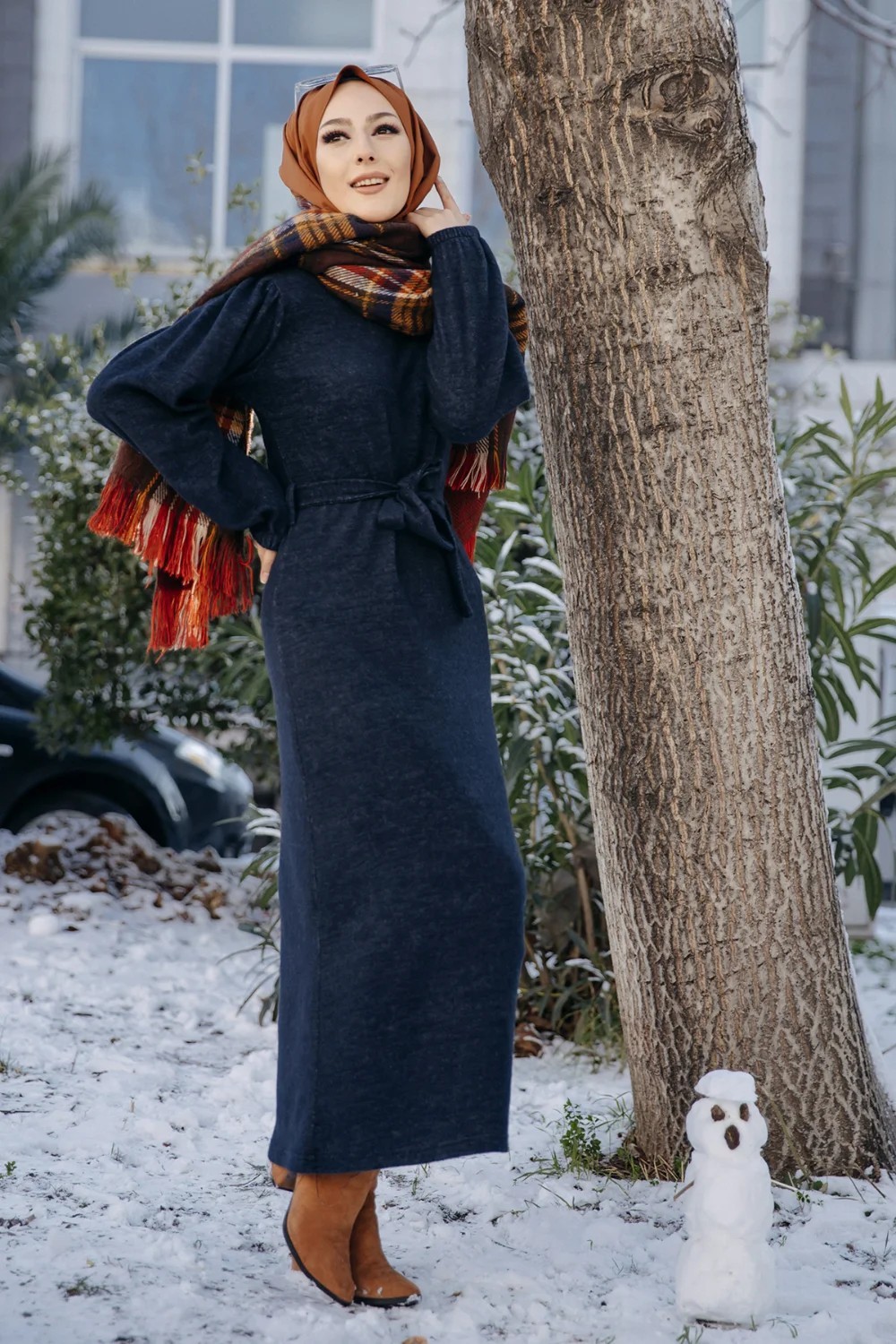 Robe tissu polaire avec ceinture (Vêtement Hijab Saison Automne-Hiver) - Couleur bleu marine Vetement & Accessoire