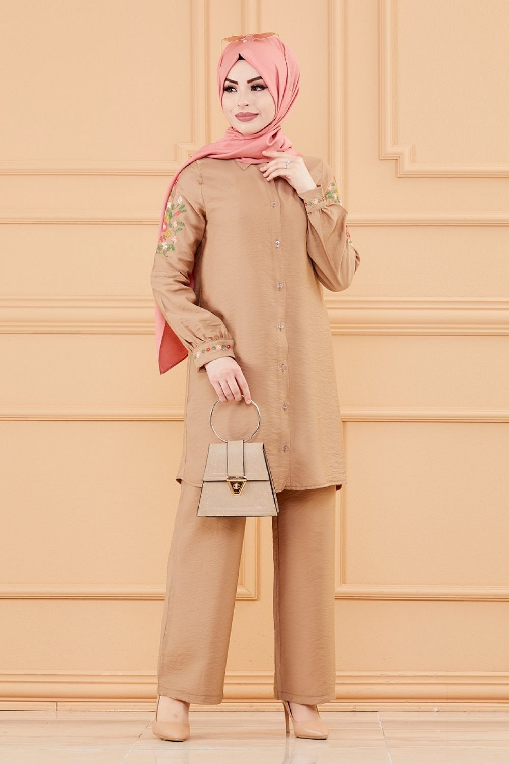 Ensemble style habillé pour femme (tunique/chemise avec broderie et pantalon) - Couleur beige Vetement & Accessoire