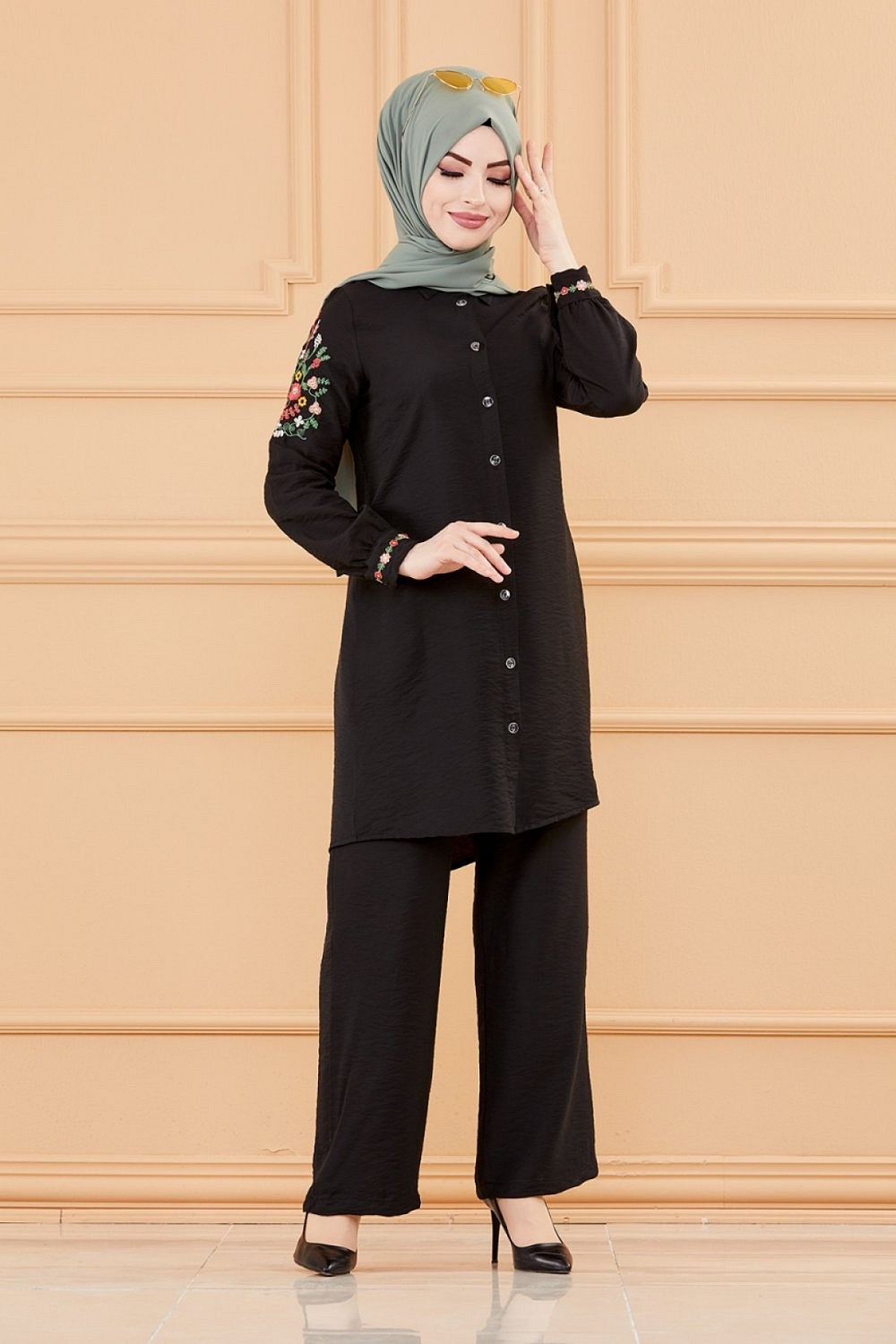 Ensemble chic pour femme (tunique/chemise brodée et son pantalon assorti) - Couleur noir Vetement & Accessoire