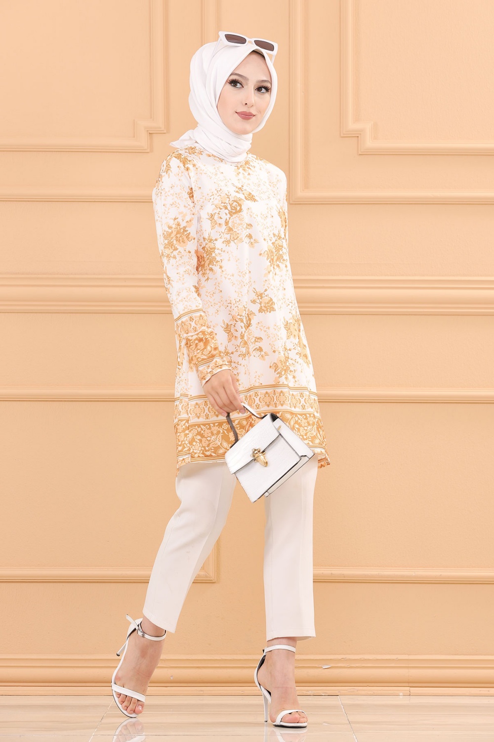 Tunique motifs fleurs et arabesques pour femme (Vêtement Hijab Chic) - Couleur vison Vetement & Accessoire