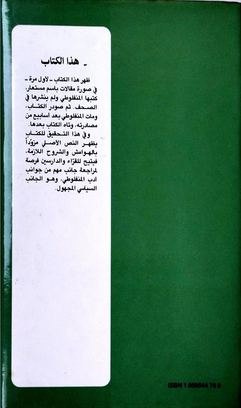 " وفي هذا التحقيق للكتاب يظهر النص الأصلي مزوداُ بالهوامش والشروح اللازمة ، لمراجعة جانب من مهم من جوانب أدب المنفلوطي و هو الجانب السياسي المجهول "