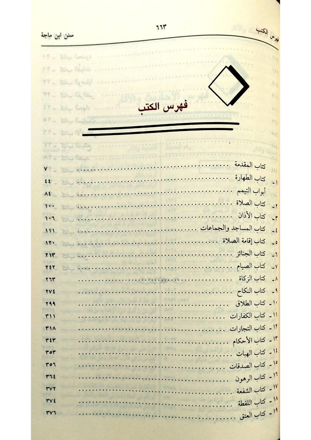 سنن ابن ماجة هو أحد الكتب الستة دواوين الإسلام التي هي أمهات كتب السنة وأهم أصولها لجامعها الحافظ أبي عبد الله محمد بن يزيد القزويني (209-273هـ) أحد أئمة الحديث الذين أفنوا أعمارهم في تدوين الحديث وجمعه من رواته في وذلك بالسفر إلى الأقطار البعيدة والطواف على مجالس الرواة. وهذه الطبعة طبعة جديدة منقحة ومرتبة ومزيدة، تم ضبط أرقام الأبواب فيها على أساس المعجم المفهرس لألفاظ الحديث وتحفة الأشراف. وقد تم تلوين عناوين الأبواب وأرقام الأحاديث والآيات القرآنية وبعض الكلمات بالحمرة تسهيلا للبحث والانتفاع بهذا الكتاب.