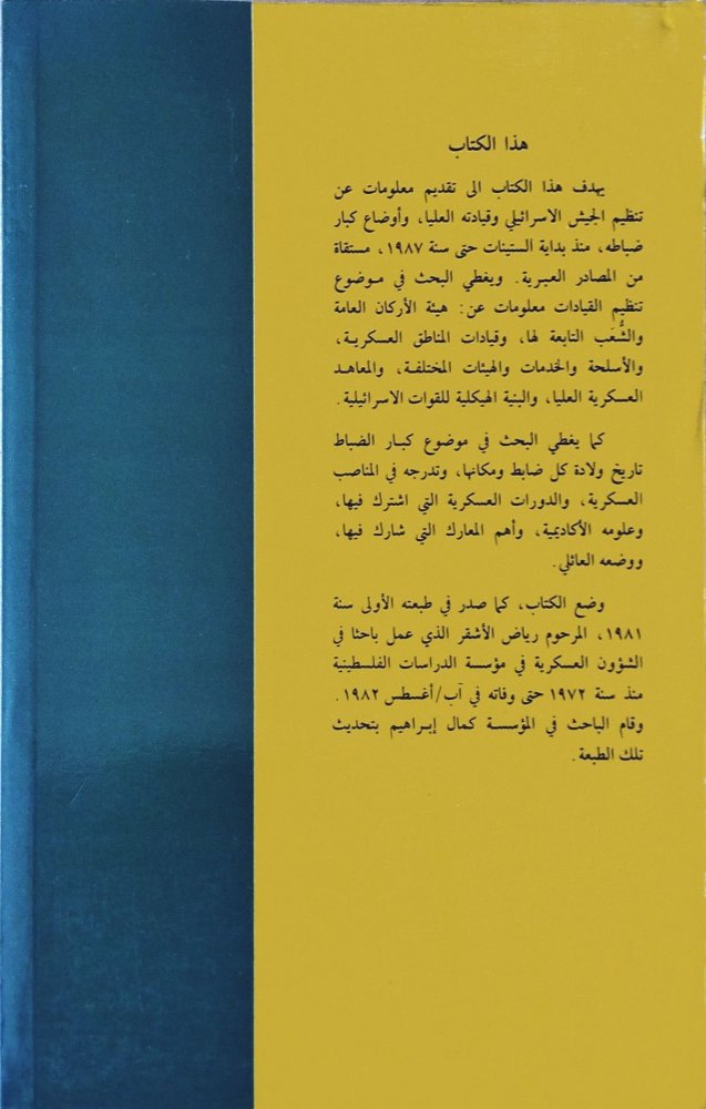 هذه الدراسة تستند إلى مصادر عبرية وهي نسخة مزيدة ومحدثة من الدراسة التي كانت أصدرتها المؤسسة سنة 1981. تتناول تنظيم الجيش الإسرائيلي، وكوادره العليا وكبار ضباطه، وإعادة تنظيم الأسلحة البرية سنة 1983. كما تشمل رسماً بيانياً يوضح العلاقة بين رؤساء أجهزة الاستخبارات الإسرائيلية مثلما نظمت بعد حرب 1973.