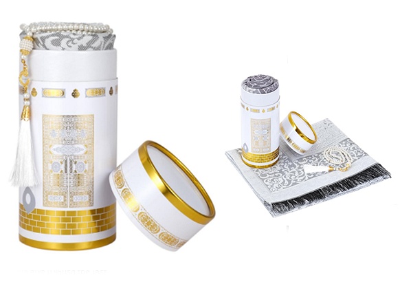 Jolie boite cadeau ronde dorée contenant un tapis brodé blanc (taille adulte avec motifs) et un chapelet assorti de luxe à 99 perles, avec décorations métalliques.