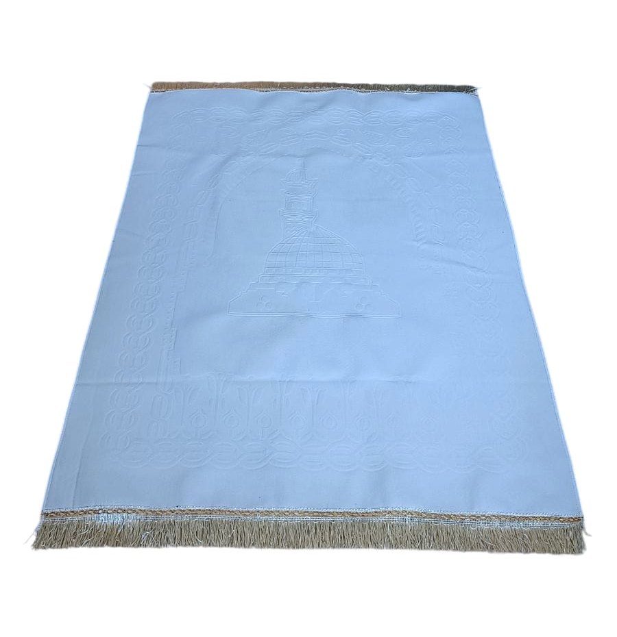 Tapis adulte de couleur blanc avec sa boite cadeau et chapelet (sebha) assortis. Jolie boite cadeau Blanche et dorée contenant un tapis uni avec motifs discrets (taille adulte) et un chapelet assorti de luxe à 99 perles, avec décorations métalliques.