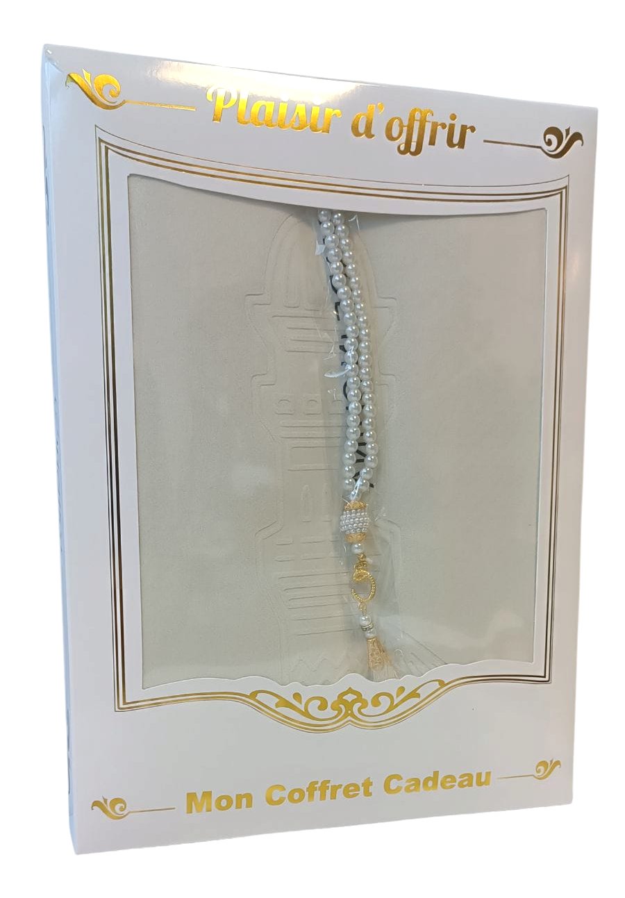 Coffret Cadeau "Kaaba" : Boite cadeau avec Tapis et Chapelet deluxe assorti - Couleur Blanc Doré - REF. 39446 (12.90 €)