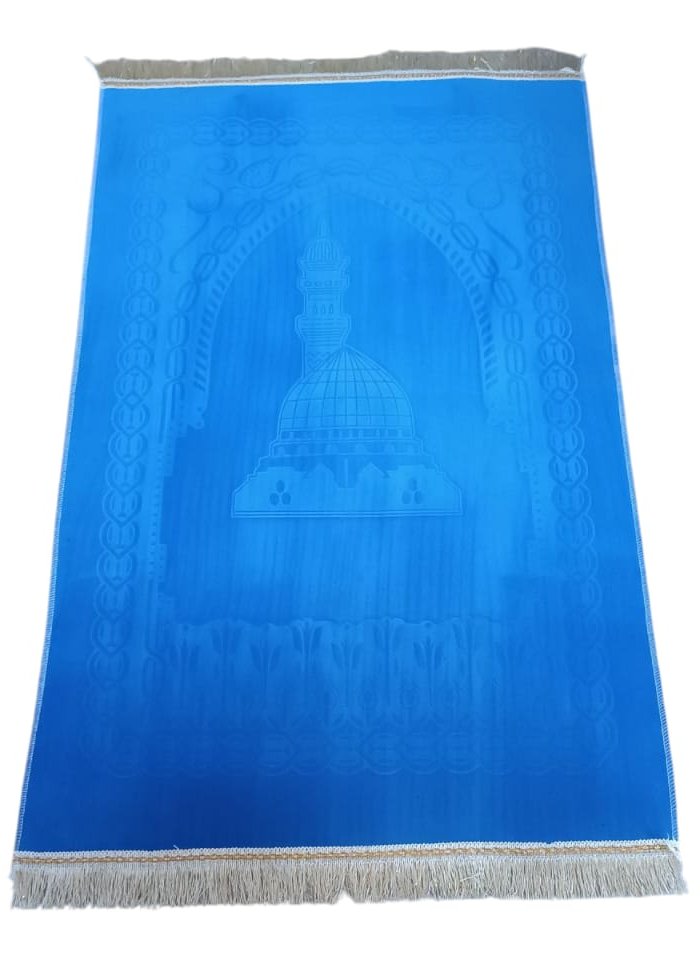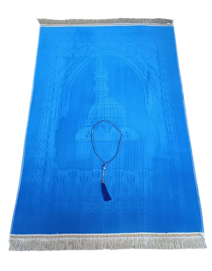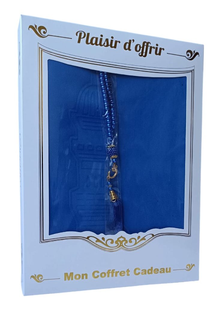 Jolie boite cadeau Blanche et dorée contenant un tapis de couleur Bleu uni avec motifs discrets (taille adulte) et un chapelet assorti de luxe à 99 perles, avec décorations métalliques.