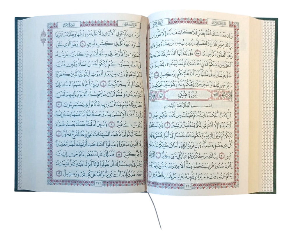 Très beau Coran, en langue arabe uniquement, selon l'école de récitation "Hafs" (رواية حفص), couverture en similicuir de luxe avec décorations dorées, papier de qualité supérieur (chamois) et impression en noir + une seconde couleur, doté d'un ruban marque page. Existe en plusieurs autres couleurs de couverture.