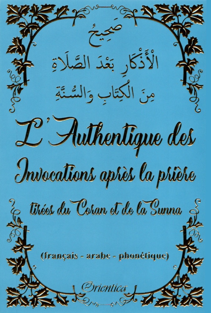 L'Authentique des Invocations après la prière tirées du Coran et de la Sunna (Sahîh Al-Adhkâr Ba‘da As-Salât mina-l-Kitâb wa-s-Sunna صَحِيحُ الْأَذْكَارِ بَعْدَ الصَّلَاةِ مِنَ الْكِتَابِ وَالسُّنَّةِ) en français - arabe - phonétique. Couverture bleue dorée.