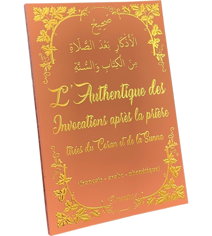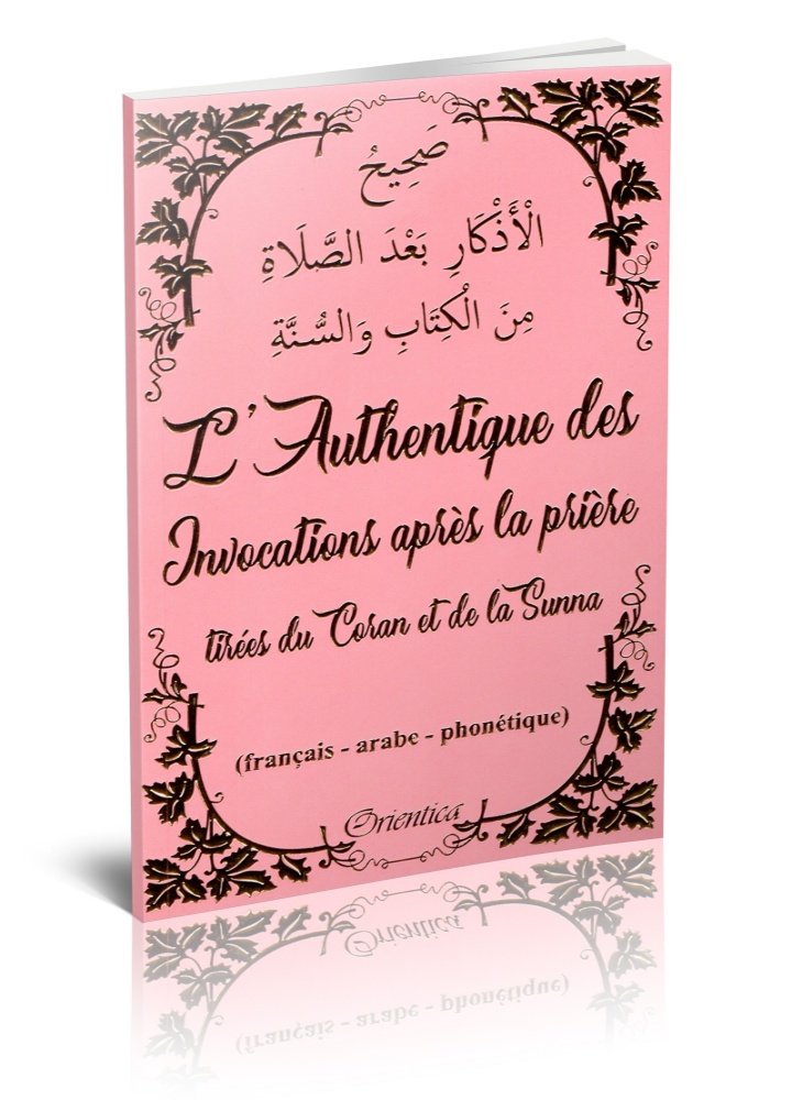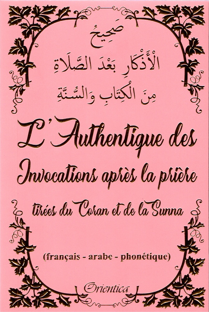 L'Authentique des Invocations après la prière tirées du Coran et de la Sunna (Sahîh Al-Adhkâr Ba‘da As-Salât mina-l-Kitâb wa-s-Sunna صَحِيحُ الْأَذْكَارِ بَعْدَ الصَّلَاةِ مِنَ الْكِتَابِ وَالسُّنَّةِ) en français - arabe - phonétique. Couverture rose dorée.