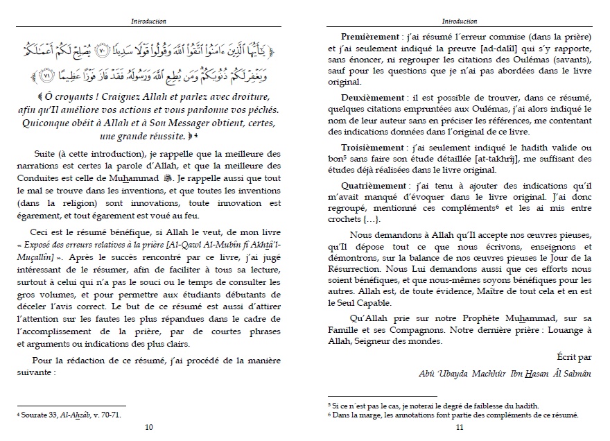 Cheikh Machhûr ibn Hasan Âl Salmân : « Ceci est le résumé de mon livre ‘‘Les erreurs relatives à la prière’’ (Al-Qawl Al-Mubîn fî Akhtâ’-l-Muçallîn). Après le succès rencontré par ce livre, j’ai jugé intéressant de le résumer, afin de faciliter à tous sa lecture, surtout à celui qui n’a pas le souci ou le temps de consulter les gros volumes, et pour permettre aux étudiants débutants de déceler l’avis correct. L’objectif est aussi d’attirer l’attention sur les fautes les plus répandues. »