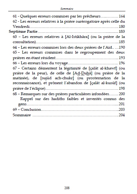 Ce livre se compose de plusieurs parties traitant en détail : les erreurs se rapportant aux vêtements, aux lieux et à la façon de prier, à la prière à la mosquée et aux erreurs commises après la prière et celles relatives à la prière du vendredi et à toutes les autres prières...