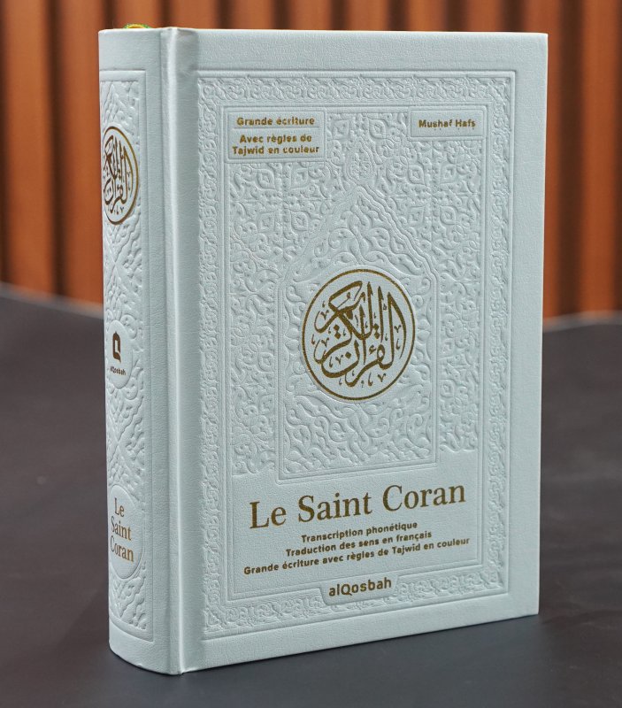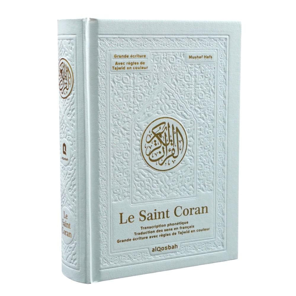 Le Saint Coran Hafs avec grands caractères - Transcription phonétique - Traduction des sens en français - Grande écriture et Regles de Tajwid en couleur et Vidéos - Code QR - Blanc doré 13,5 x 18 cm - REF. 40927 (29.90 €)