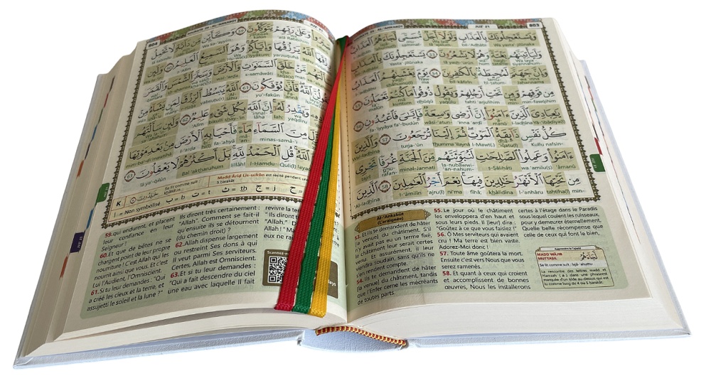Les règles de tajwid sont données par un système de couleur intuitif pour apprendre les règles de lecture et de psalmodie du Saint Coran et le code QR (présent sur chaque page) permet d'ouvrir une vidéo sur son smartphone et d'écouter et suivre la lecture du Coran par cheikh Soudays.