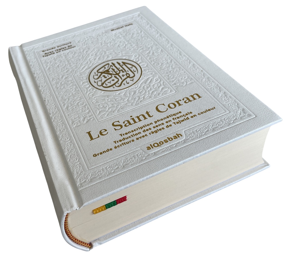 Version avec 1220 pages, grande écriture de l'arabe (grands caractères) et règles de tajwid en couleur. Couverture rigide cuir de luxe blanche dorée. Les trois marques pages (rouge, vert et jaune) vous permet de marquer et de réviser plusieurs sourates ou parties du Coran à la fois.