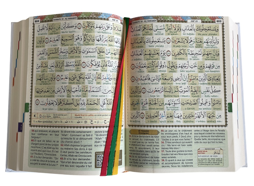 Coran adapté aux public francophone et aux débutants en langue arabe... Scannez le code QR sur les pages avec votre smart-phone pour voir la vidéo et écouter le Coran en suivant avec la main la lecture... Les 30 parties-juz du coran sont repérées par des index en couleur.