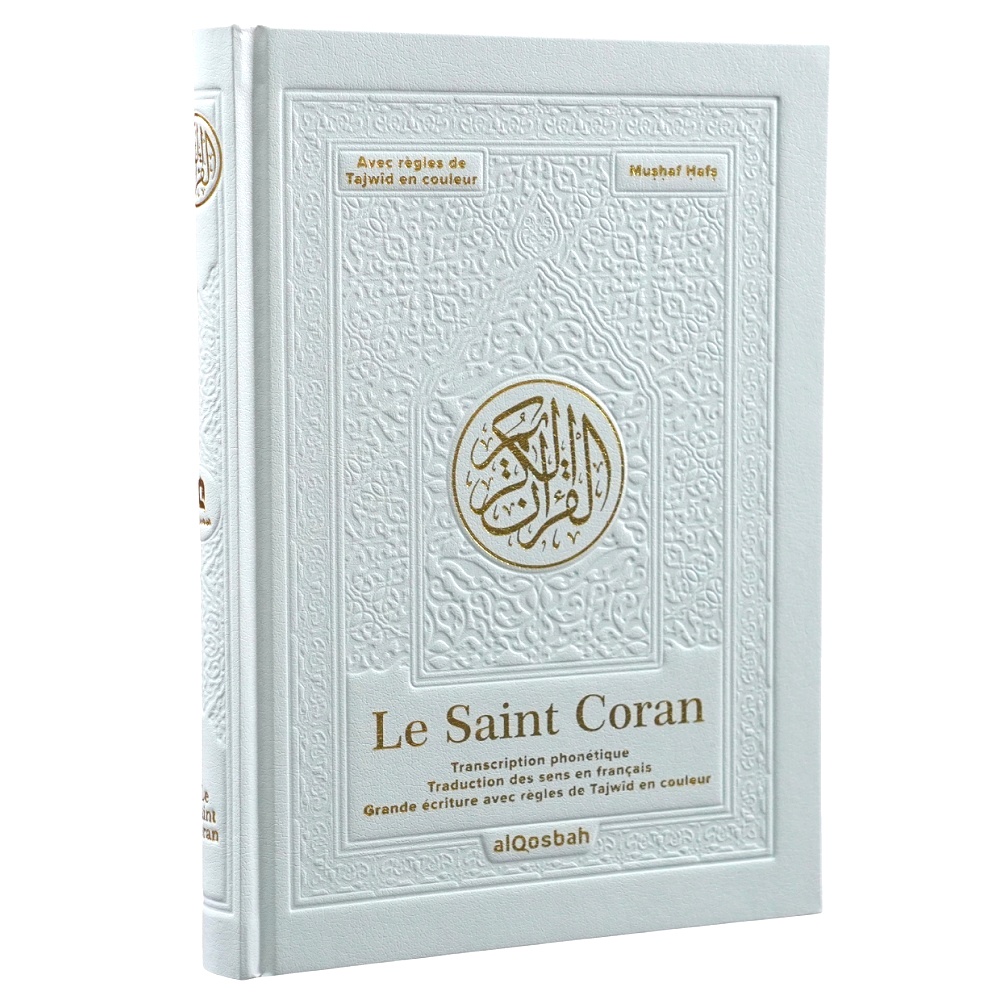 Le Saint Coran Hafs avec grands caractères - Transcription phonétique - Traduction des sens en français - Grande écriture et Regles de Tajwid en couleur et Vidéos - Code QR - Blanc doré 13,5 x 18 cm - REF. 40927 (29.90 €)
