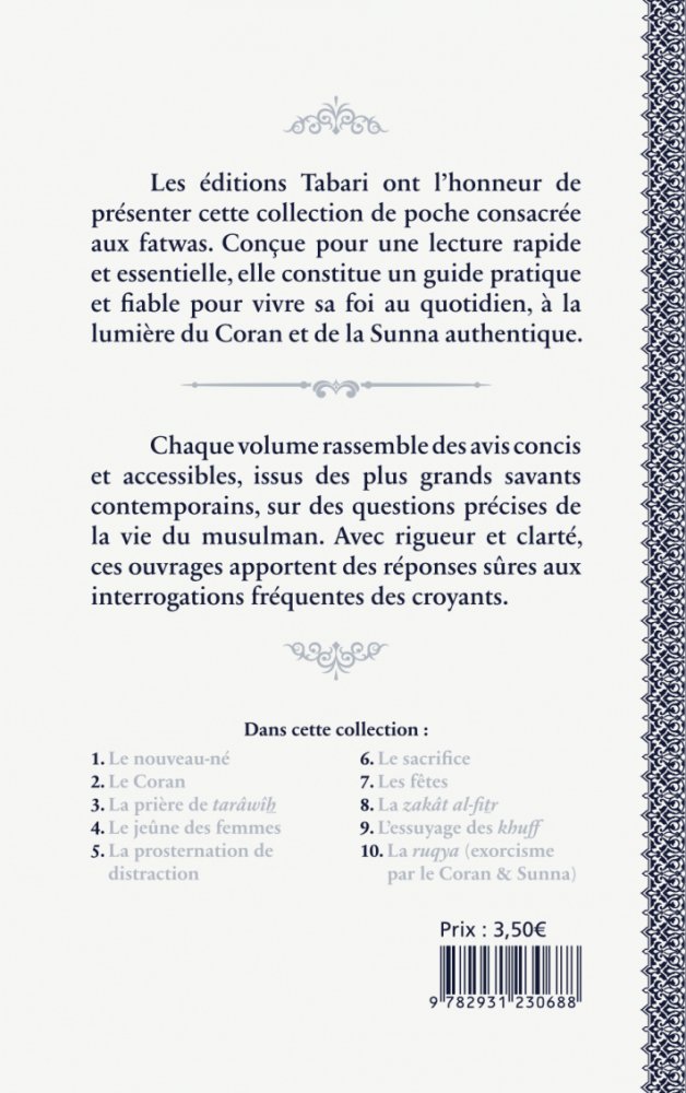 Le livre « Les Fatwas des grands savants sur la prière du Fajr » regroupe les avis et enseignements de sommités islamiques telles que Cheikh Ibn Bâz, Cheikh al-‘Uthaymîn et le Comité permanent de l’Iftâ. Publié par les Éditions Tabari, cet ouvrage éclaire en profondeur le statut, les vertus et les règles de la prière de l’aube (Salât al-Fajr), l’un des actes d’adoration les plus méritoires en islam.