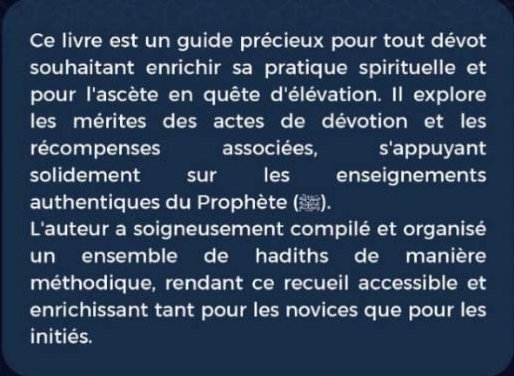 Ce livre est un guide précieux pour tout dévot souhaitant enrichir sa pratique spirituelle et pour l'ascète en quête d'élévation. Il explore les mérites des actes de dévotion et les récompenses associées, s'appuyant solidement les enseignements sur authentiques du Prophète (paix et salut sur lui).