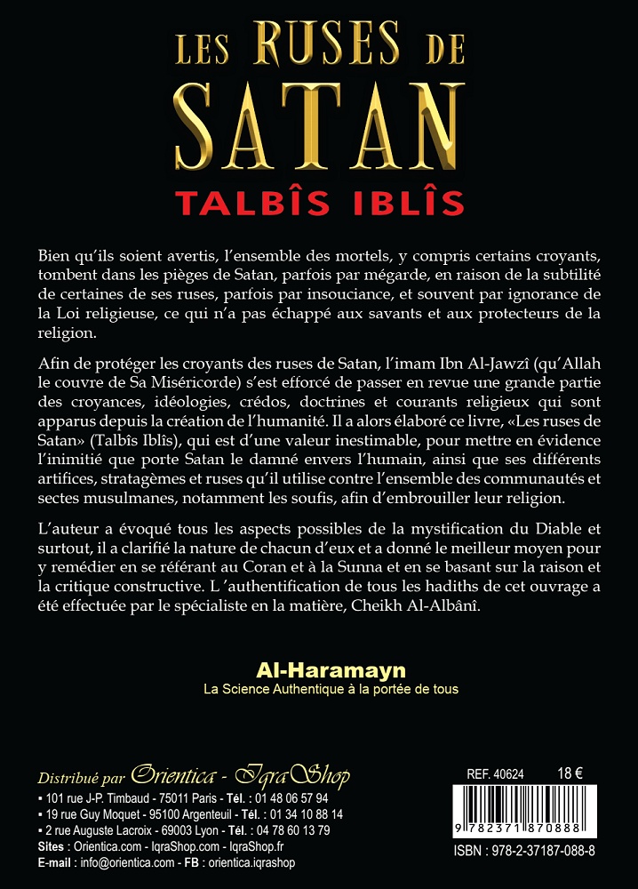 Afin de protéger les croyants des ruses de Satan, l’imam Ibn Al-Jawzî (qu’Allah le couvre de Sa Miséricorde) s’est efforcé de passer en revue une grande partie des croyances, idéologies, crédos, doctrines et courants religieux qui sont apparus depuis la création de l’humanité. Il a alors élaboré ce livre, «Les Ruses de Satan» (Talbîs Iblîs), qui est d’une valeur inestimable, pour mettre en évidence l’inimitié que porte Satan le damné envers l’humain, ainsi que ses différents artifices, stratagèmes et ruses qu’il utilise contre l’ensemble des communautés et sectes musulmanes, notamment les soufis, afin d’embrouiller leur religion.