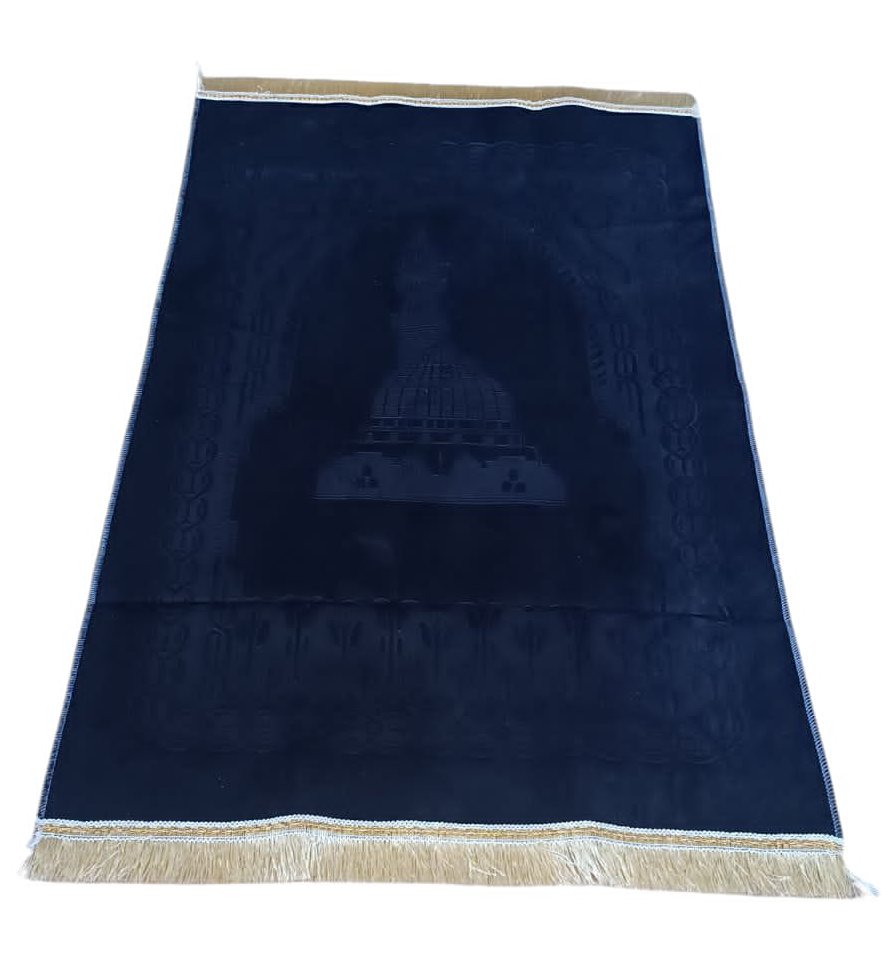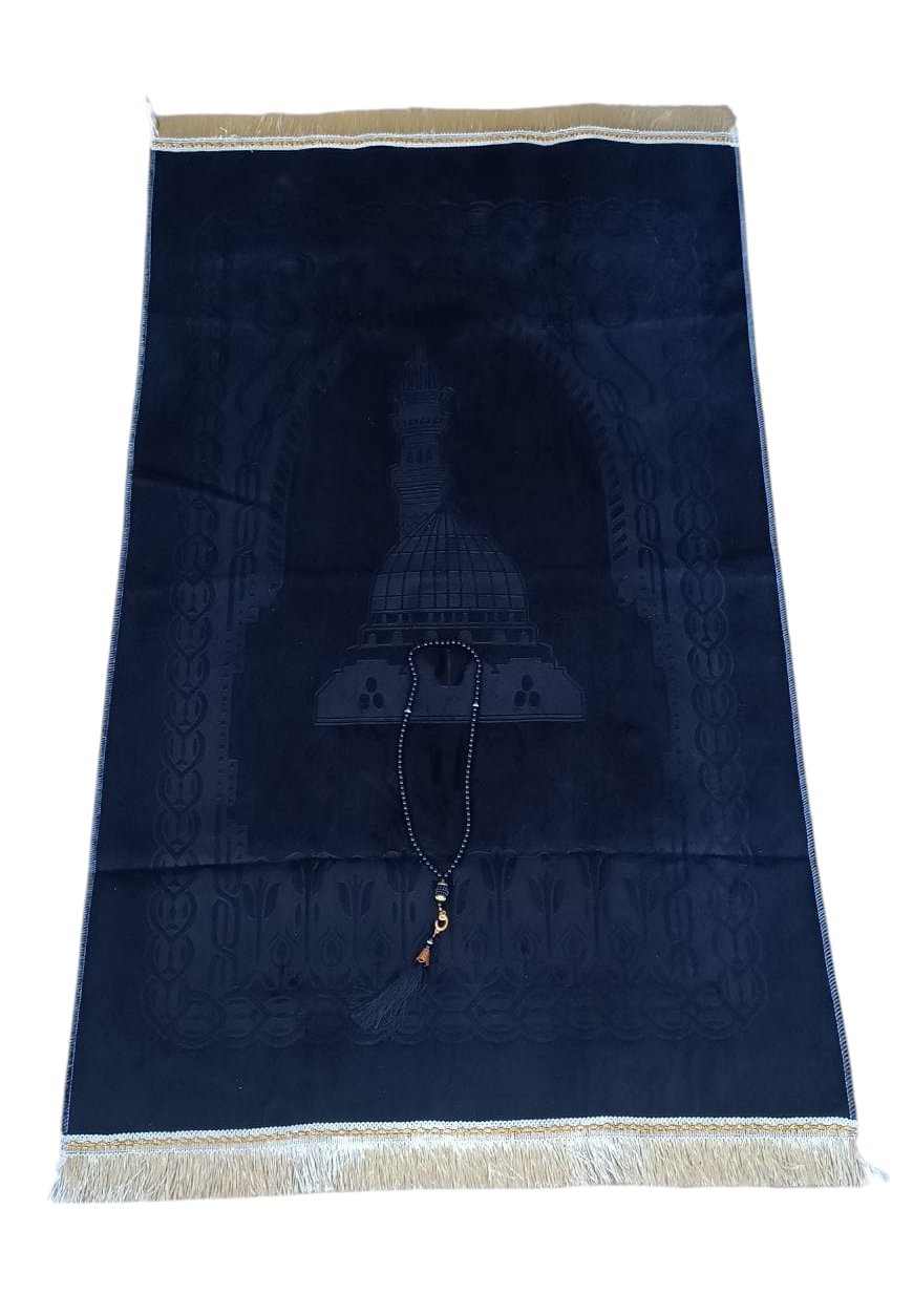 Jolie boite cadeau Blanche et dorée contenant un tapis de couleur noir uni avec motifs discrets (taille adulte) et un chapelet assorti de luxe à 99 perles, avec décorations métalliques.