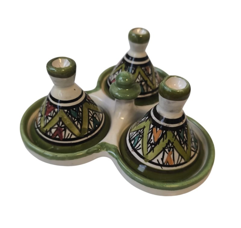 Ces tajines triples sont utilisés comme vaisselle de présentation, comme porte épices, ou simplement pour décorer votre intérieur pour une ambiance relevée en goût... A la marocaine !