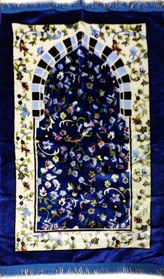 Tapis de prière adulte bleu marine et jaune avec motifs petites feuilles et fleurs multicolores...