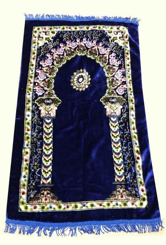 Tapis de prière musulman (sajjada ou sallaya) pour adulte bleu-marine motifs rosace et 2 piliers multicolores...