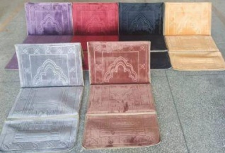 Tapis de prière musulman rembouré pliable et transportable avec sa sacoche de transport. Par une simple manipulation, se transforme rapidement de tapis à repose-dos (chaise, dossier, adossoire...)