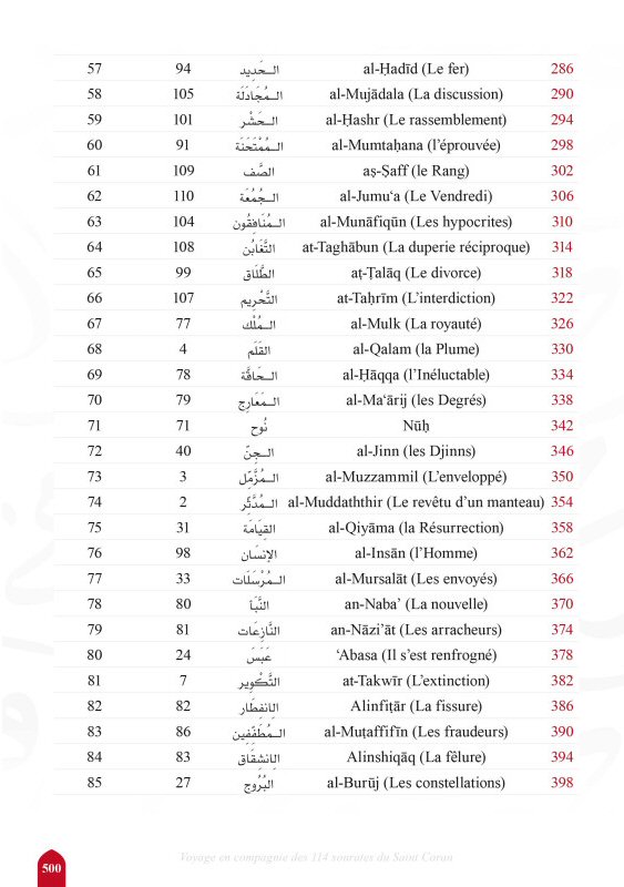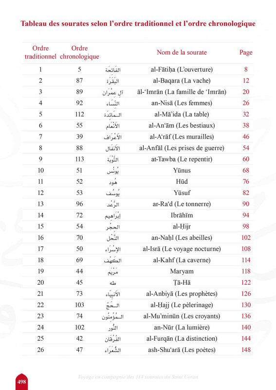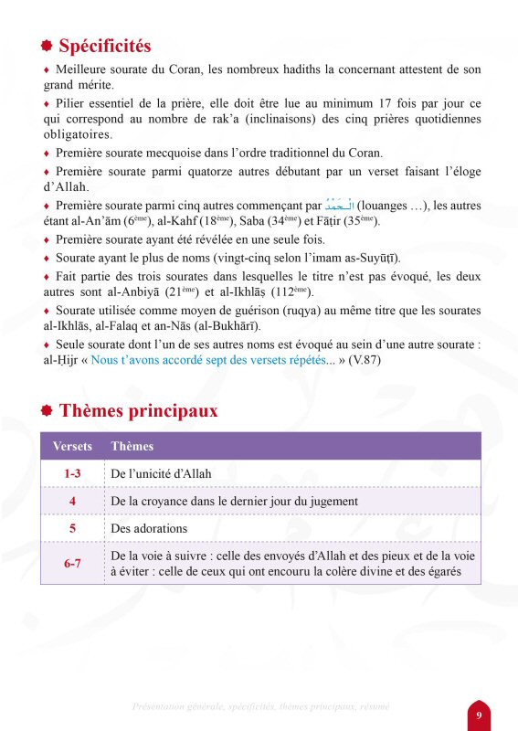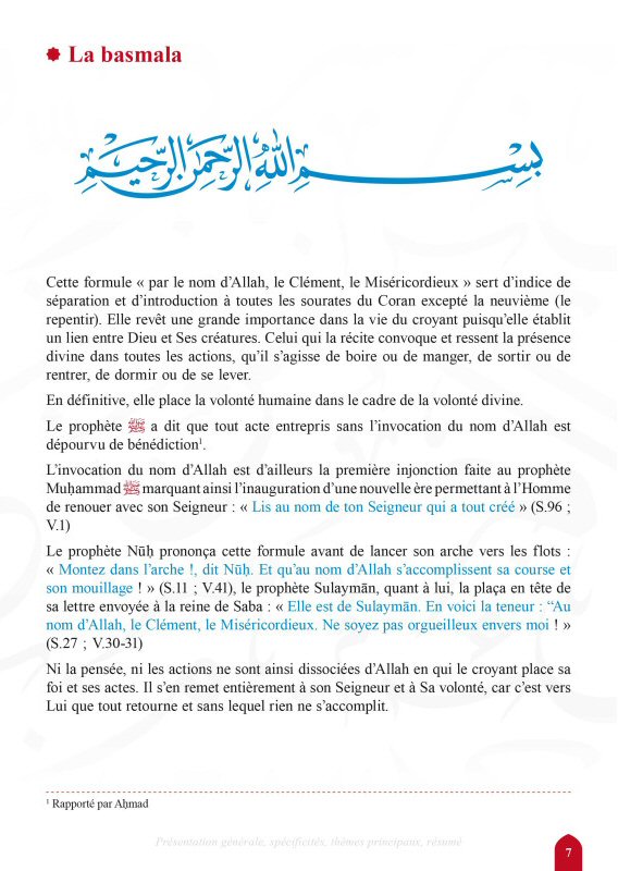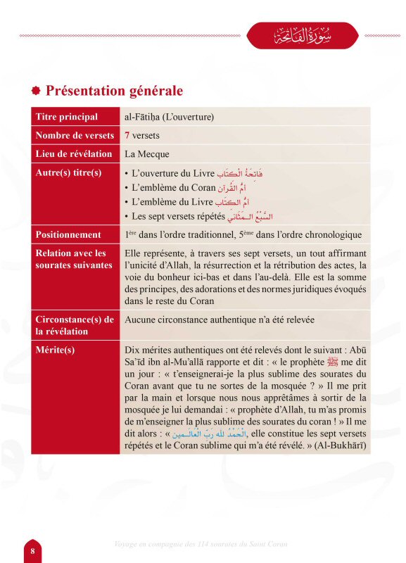 Pour une connaissance plus approfondie des sourates et une vision globale de celles-ci, nombre de notions ont été ajoutées en préambule. Elles incluent, au besoin, les différents titres des sourates, ainsi que le nombre de versets, leur lieu et les circonstances de la révélation, les mérites, les spécificités de chacune, leur positionnement traditionnel et chronologique dans le mushaf, et la relation qu'elles entretiennent entre elles...