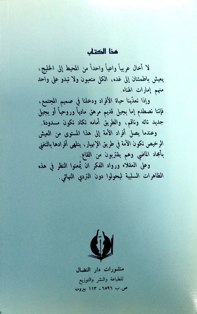 واذا تعدينا الافراد ودخلنا في صميم المجتمع ,فاننا نصطدم اما بجيل قديم مرهق مادياً وروحياً أو بجيل جديد تائه وناقم , والطريق أمامه تكاد تكون مسدوده .وعندما يصل أفراد الامه الي هذا المستوي من العيش الرخيص تكون الأمة في طريق الانهيار , يتلقي أفرادها بالتغني بامجاد الماضي وهم يقتربون من القاع .