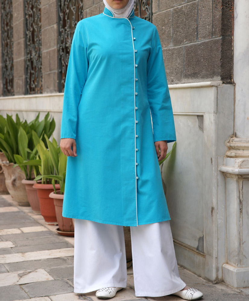 Une tunique exquise idéale pour les occasions pour avoir une tenue pudique et décente. Col mandarin, longueur aux genoux. 100 % coton, lavage machine.