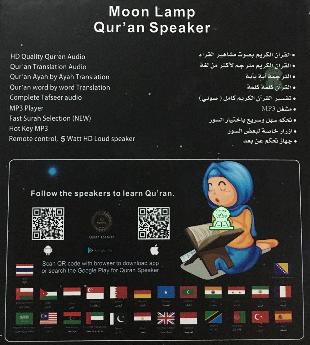 Main Function: Touch lamp, Learning, Quran reciter, Translations, MP3, Recording, Radio FM.